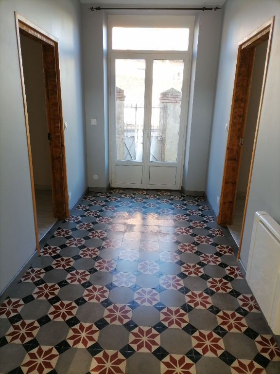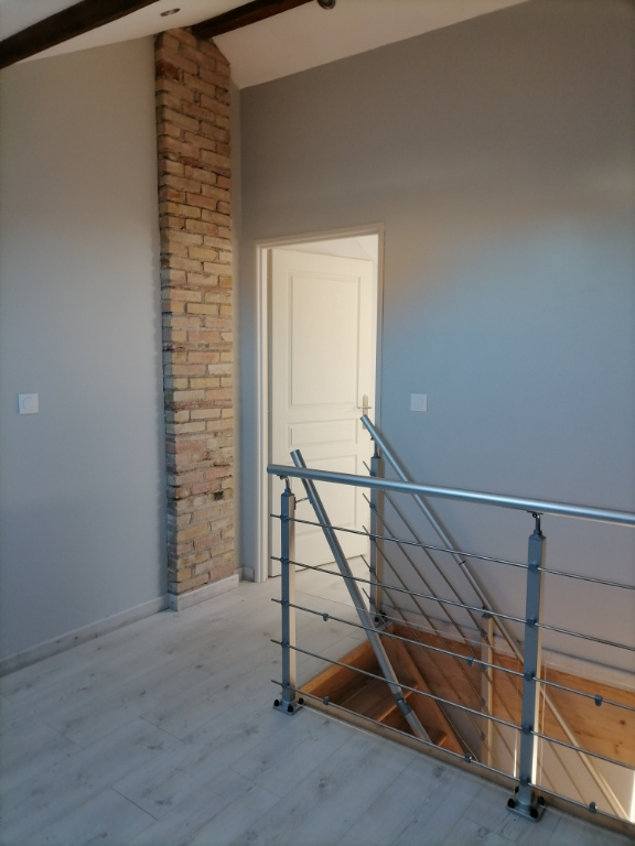 Maison sur deux niveaux composée en rez-de-chaussée : Pièce de vie, cuisine équipée ( plaque, hotte, four, lave vaisselle), 2 chambres, salle d'eau avec wc et buanderie. A l'étage : un dégagement et une troisième chambre.