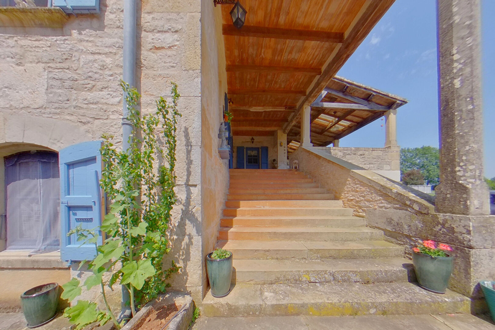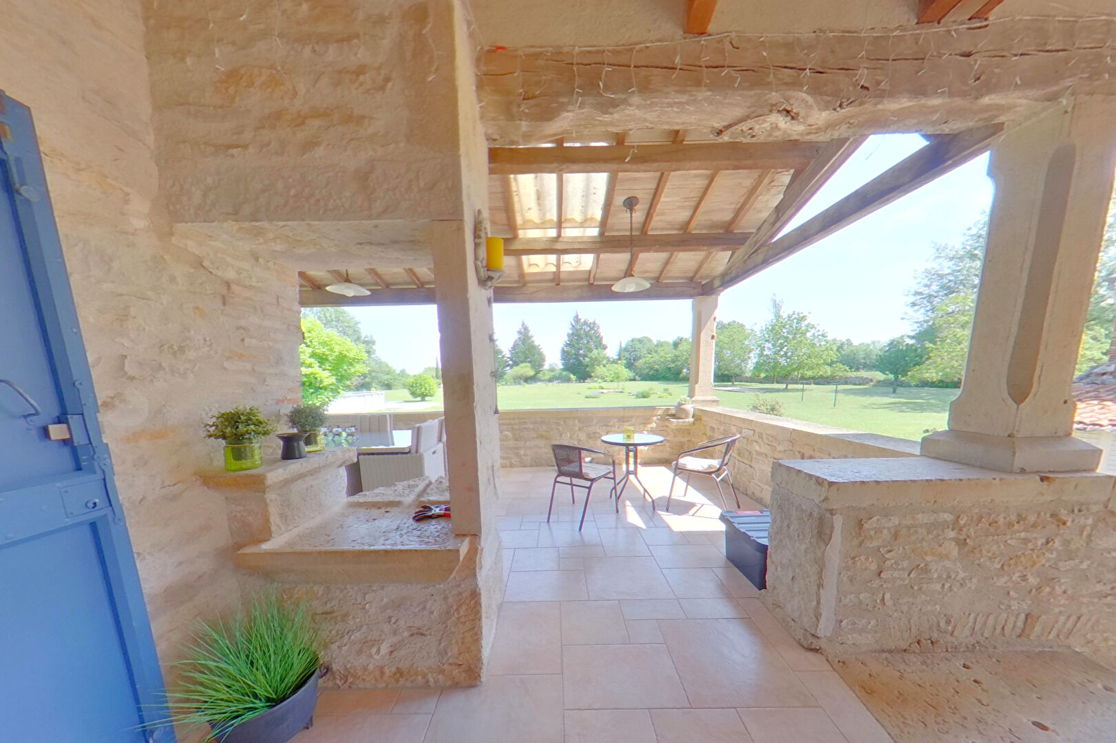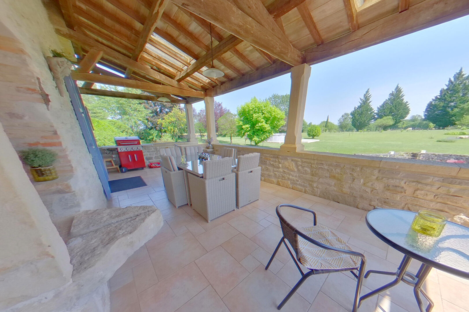 Au rez-de-chaussée il y a la possibilité de créer un appartement indépendant avec sa propre porte d'entrée. Actuellement il y a une salle de gym, deux chambres et une salle de bain avec WC indépendant. Il y a un escalier à l'intérieur qui communique avec le reste de la maison. Nous entrons dans l'habitation principale par l'escalier grandiose en pierre et la grande terrasse couverte qui donne sur le parc avec ses arbres matures, et la piscine hors sol. A cet étage un joli salon avec insert qui chauffe la chambre au-dessus, la salle à manger, la cuisine, wc et suite parentale avec salle d'eau. A l'étage se trouvent deux belles chambres et un grand espace de lecture et la salle d'eau familiale. Sous la maison se trouve la buanderie/cuisine d'été et sous la terrasse couverte, la sauna.