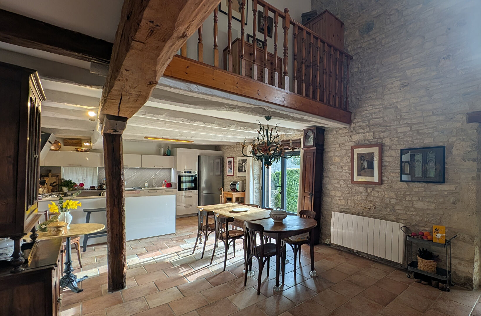 La jolie terrasse bordée de massifs de fleurs abondants mène à la porte d'entrée. La maison dispose, au rez-de-chaussée, d'une immense salle composée d'une partie salon avec baie vitrée sur le jardin, et les canapés autour du poêle à bois, la salle à manger avec son plafond cathédral, donnant sur la galerie du 1er étage et la cuisine IXINA haut de gamme, équipée d'une plaque de cuisine à gaz XL, 5 feux, avec hotte, double four, lave-vaisselle et frigo/congélateur Bosch. L'arrière cuisine abrite également la buanderie et un petit couloir mène au vestiaire et toilettes. Au premier étage, la galerie dessert les quatre chambres confortables dont deux avec portes fenêtres qui donnent sur le jardin et la campagne et une avec dressing. Une salle de bain avec baignoire, lavabo et WC et une salle d'eau avec douche, vasque et WC ont été rénovées tout récemment.