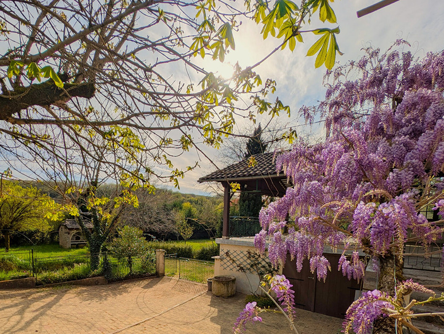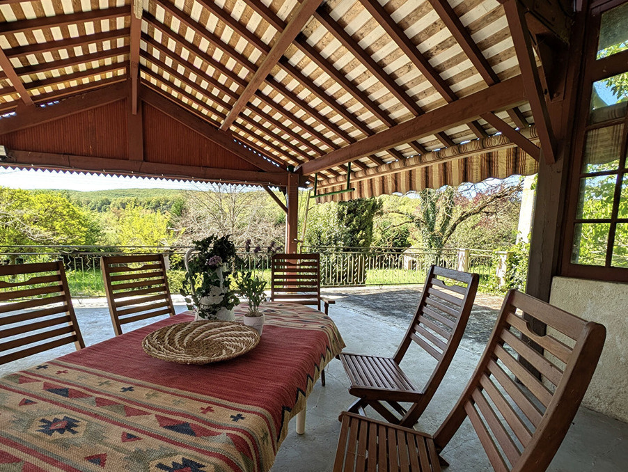 A l'extérieur, une cuisine d'été et sur l'autre côté (sud-ouest) une énorme terrasse couverte de 50m2 surplombant le jardin arboré en face d'un four à pain. En contrebas, sous la maison, sont plusieurs caves et garages d'environ 150m2 et de la place pour garer plusieurs voitures. Le grand jardin avec un puits descend à la rivière passant par des arbres fruitiers, un potager, plusieurs dépendances et fabriques de jardin.