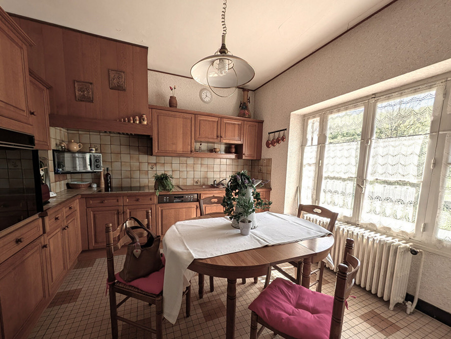 La maison plain-pied s'accède soit par la terrasse, soit côté rue via le hall d'entrée, où se trouvent le salon-séjour ensoleillé avec poêle à bois, cuisine/salle-à-manger, salle d'eau, wc et chambre. Plus loin un deuxième salon et la véranda faisant le lien vers l'autre côté de la maison où se trouvent encore deux chambres.